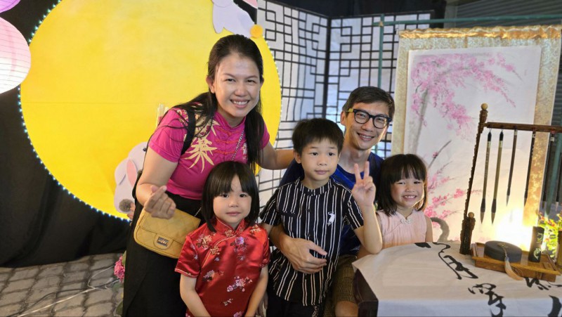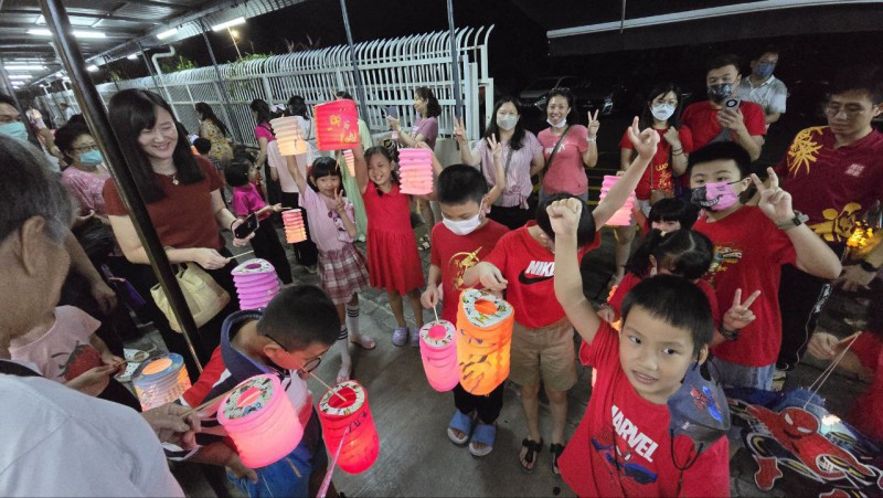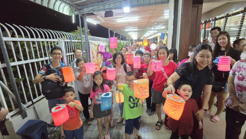 After all the entertainment, it was time for the highly anticipated lantern procession. Due to the light drizzle, the usual route around the temple was not feasible, so the procession took place in the covered corridors of the temple. Under the guidance of "actors" such as Chang'e, the Jade Rabbit, the Seven Fairies, and Wu Gang's guards, the participants walked two full rounds carrying their lanterns. After the procession, there were light refreshments and games. The organizers prepared four game stations, which offered many prizes for participants who completed their goals. The games also served as a fun way to strengthen family bonds. The Mid-Autumn Festival cum Birthday Celebration concluded on a joyful note with everyone leaving in high spirits.