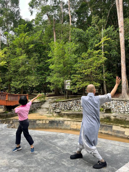 Ven. Zhen Ru, who was most familiar with the park, introduced the surroundings to everyone and led us to do some fitness exercises by the pond. It was a rare opportunity to be in a natural oxygen bar! He introduced a set of exercises created by Ven. Zhen Hua called "Ten Directions Fist," which includes four sets of movements: punching in ten directions, turning the Dharma wheel, waist exercises, and movement of hands and feet. We are grateful for the introduction, and Zhenru Shifu informed us that we could find videos to practice at home. Everyone enjoyed learning the exercises and broke a good sweat. After a short rest, we prepared for the next activity.