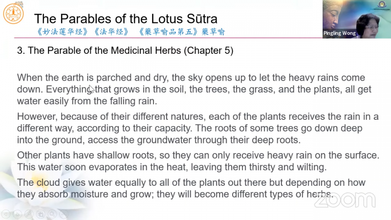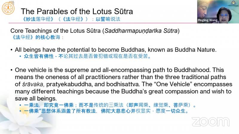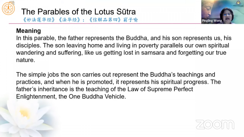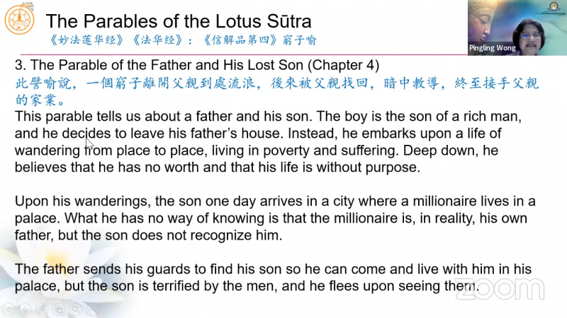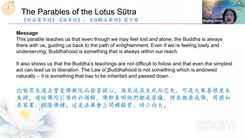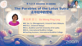 Teaching Assistant of International Buddhist College, Sis Wong Ping Ling shared on "The Parables of The Lotus Sūtra ( part 1 )".
