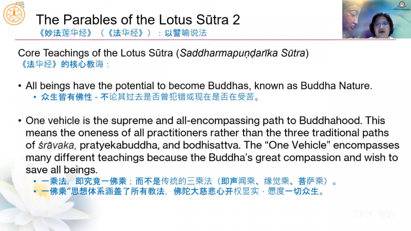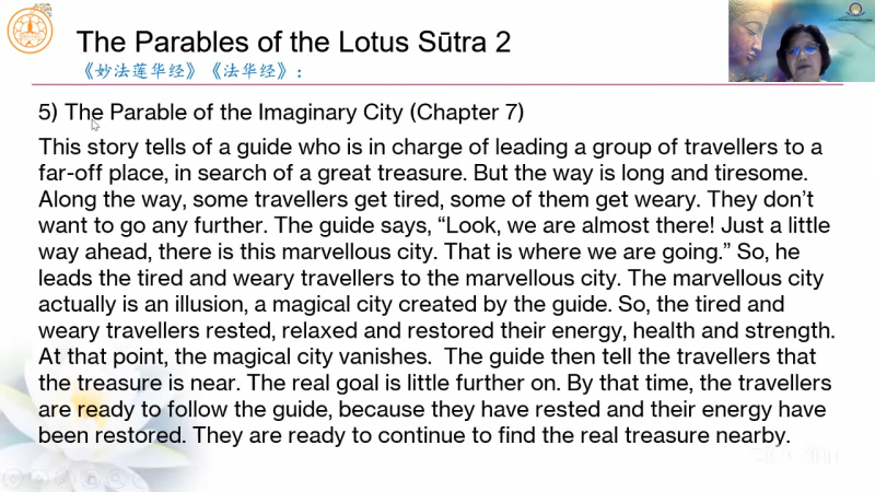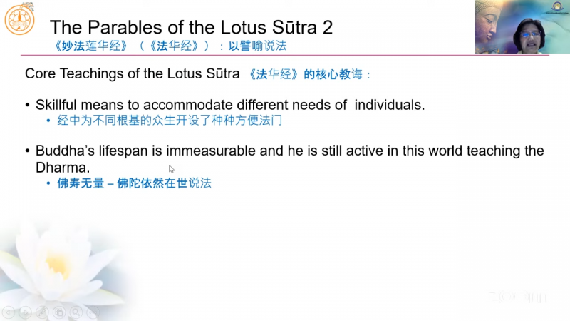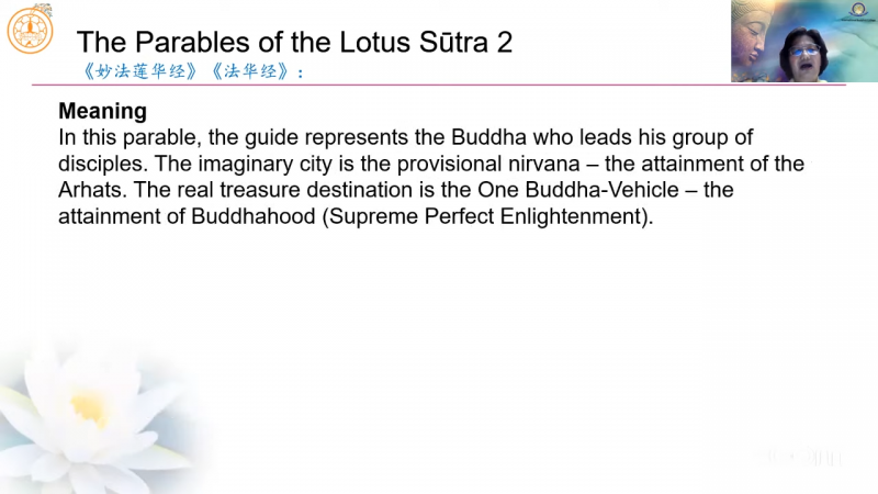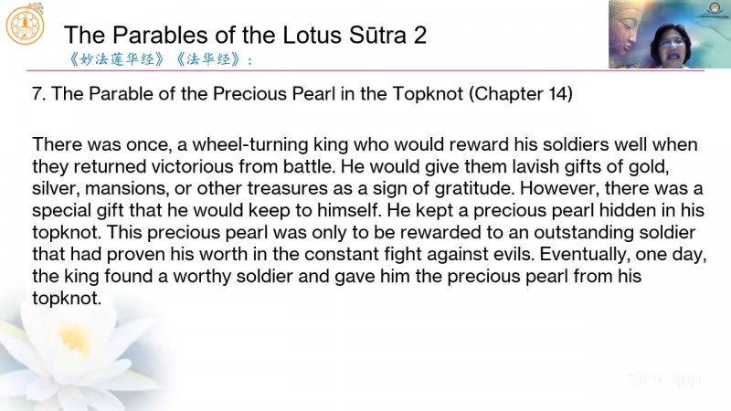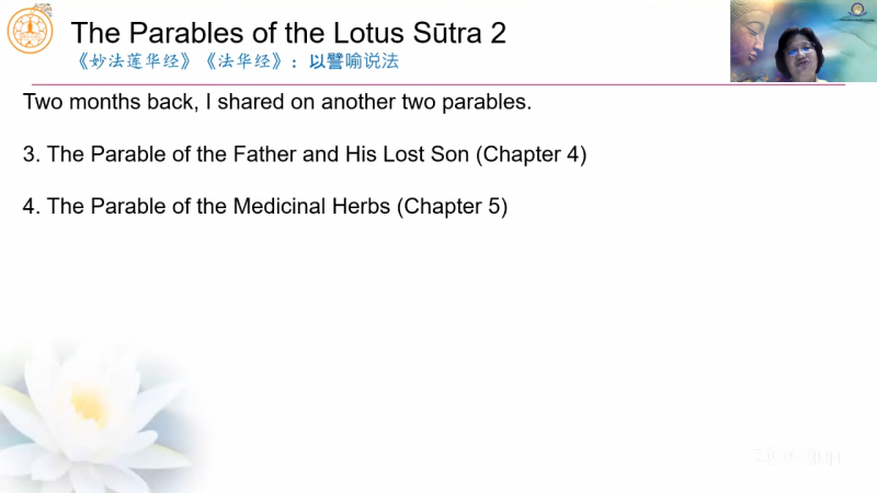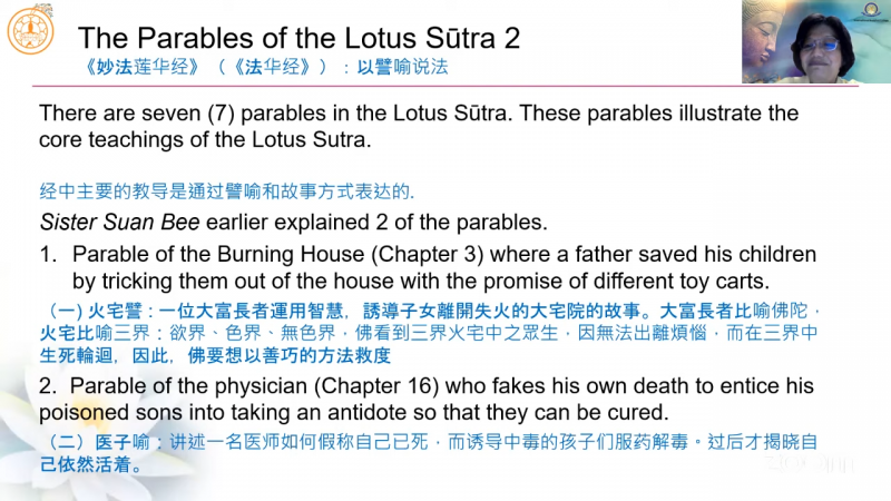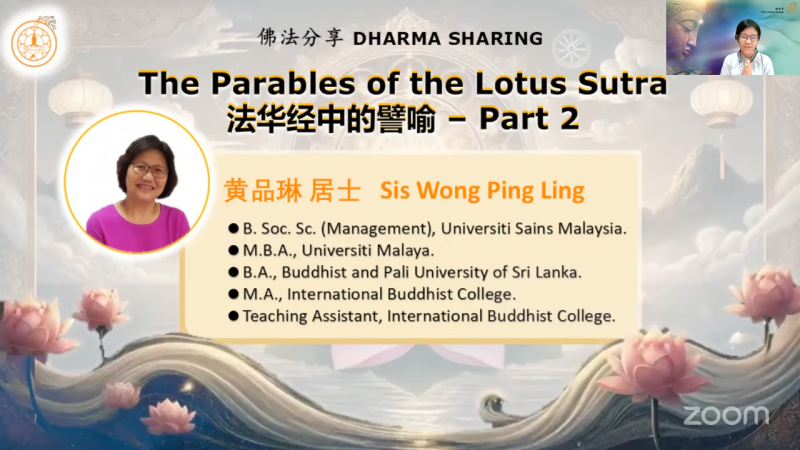 Teaching Assistant of International Buddhist College, Sis Wong Ping Ling shared on "The Parables of The Lotus Sūtra ( Part 2 )".