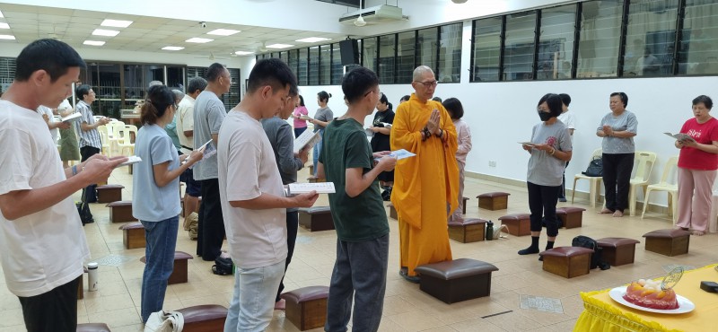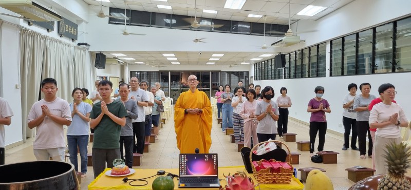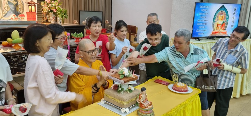That evening, everyone gathered at the Great Compassion Hall, and participated happily in the celebration. The birthday celebration is a day for everyone to celebrate their birthdays together in a Buddhist way. Before the celebration began, the Brahma Voice Group's members led everyone in chanting the Verse in Praise of Amitabha Buddha, reciting the Buddha’s name, and circumambulating the Buddha. After the circumambulation, Venerable Zhen Ru gave a compassionate Dharma talk on the topic of “Cultivating Both Merits and Wisdom in Buddhist Practice.”