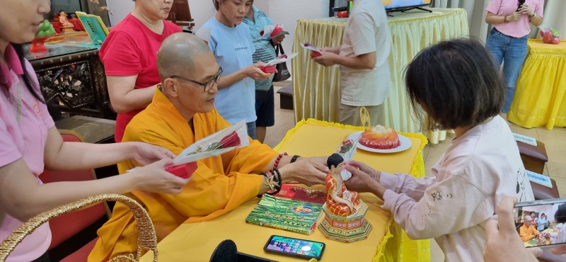 After the Dharma talk, the birthday celebration officially began. The emcee, Sister Be Hong, led everyone in singing a song called “Han Lei de Gan En (含泪的感恩).” This song talks about Mother’s Day and praises the greatness of mothers. When a mother gives birth, two lives are struggling, which includes the pain and joy of childbirth. Every year, we remember that we have passed another birthday. While happily celebrating, let’s not forget to be grateful for the kindness we have received. Perhaps there will be a day when we will realize that the preciousness of Mother’s Day is irreplaceable. After singing this song, the birthday celebrants went forward to offer red packet to Venerable Zhen Ru and received the Venerable’s blessings, including a flower and a small gift.