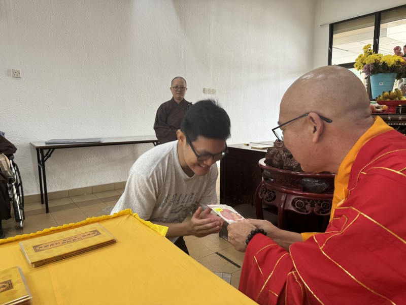Venerable Zhen Sheng emphasized that after taking refuge in the Triple Gem, everyone is still able to fulfil their filial duties and pay respects to their ancestors, but they must not take refuge in ghosts or spirits. Furthermore, Venerable briefly introduced the significance of the Five Precepts and used the analogy of “the roots of a great tree: the deeper the roots, the more luxuriant the leaves” to stress that the foundation of Buddhism lies in the three refuges and five precepts.