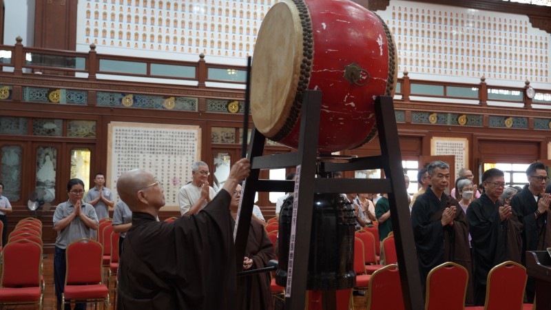 The ceremony commenced at 10 a.m. with the resonant sounds of bells and drums, struck by Venerable Zhen She. Founding Abbot Most Venerable Wei Wu and the newly appointed Abbot Venerable Zhen Sheng entered the Main Shrine Hall together, accompanied by four Monastic Council members—Venerable Zhen Ru, Venerable Zhen Nian, and Venerable Zhen Xiu—and four Lay Sangha Council members—Brother Eng Lu, Brother Lean Tong, Sister Gaik Yen, and Sister Siew Hong.
