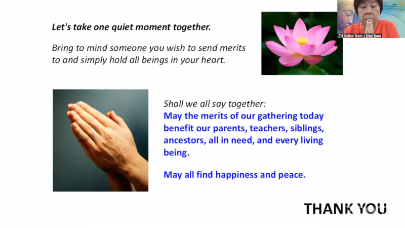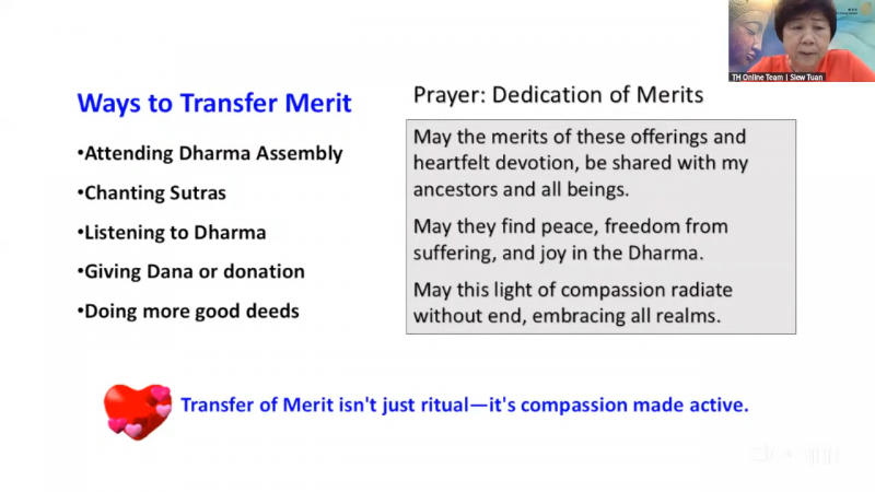 This act is the most direct practice of Transfer of Merit! By chanting and participating in the Dharma assembly, we generate merits and then dedicating to your loved ones and sentient beings. This is one way to transfer the merit.