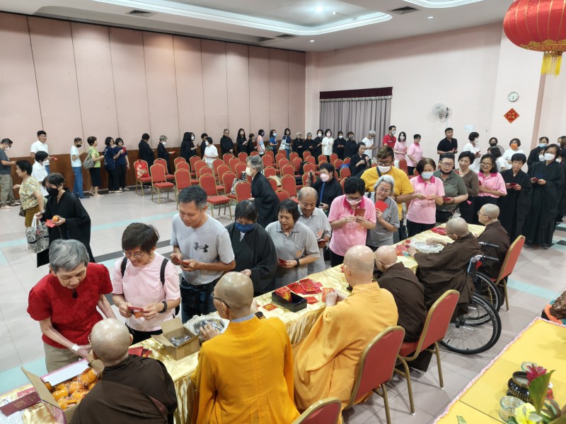 During the Dharma talk, Most Venerable Wei Wu told a story of “Maitreya Bodhisattva”. Venerable Wei Wu praised the participants, noting that it was truly precious for everyone to make the aspiration to join the retreat on the very first day of the new year. After the Dharma talk came the Sangha Blessing Session, where everyone lined up in order, offering red packets to the Sangha members. In return, they will also be receiving blessings from the Sangha members. Thus, the One-Day Retreat concluded successfully.