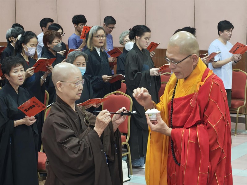 At 11:00 a.m., the noon offering ceremony was held and led by Sangha members. By offering incense, flowers, lamps, fruits, and other precious offerings, together with sincere chanting, participants expressed gratitude and reverence to the Buddhas and Bodhisattvas. After the ceremony, they followed the Sangha to the Longevity Altar in the Great Compassion Hall to dedicate blessings to those who lit lamps; then proceeded to the Patriarch Hall and the San Sheng Dian to dedicate merits. Meanwhile, other participants gathered in the Five Contemplations Hall for the noon meal, where the chanting of the Food Offering Verse and Closing Meal Verse was led by the venerable.