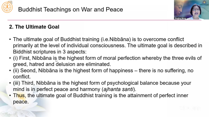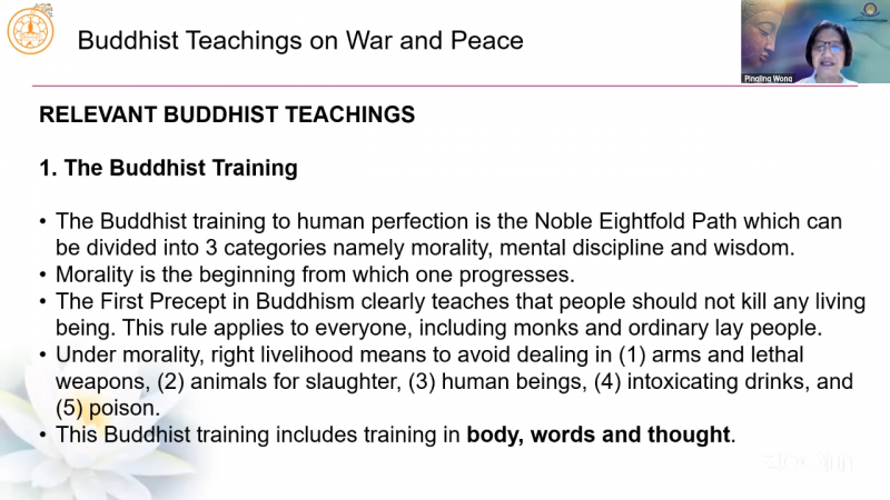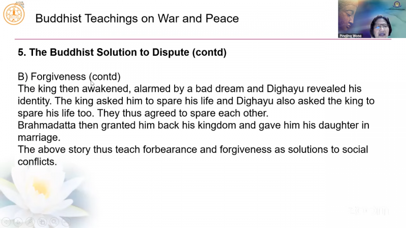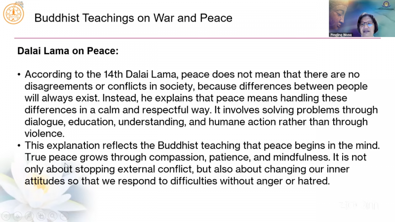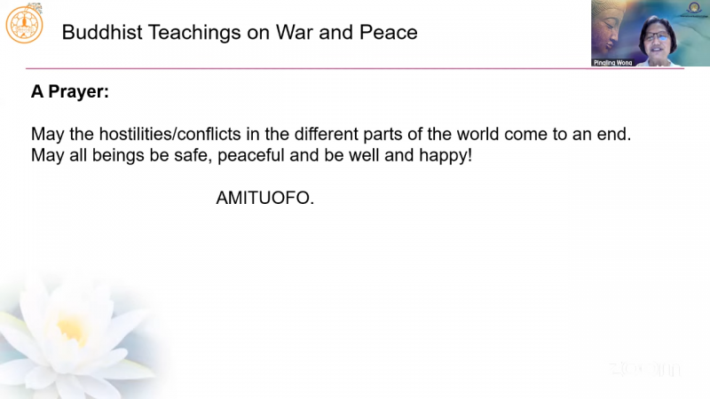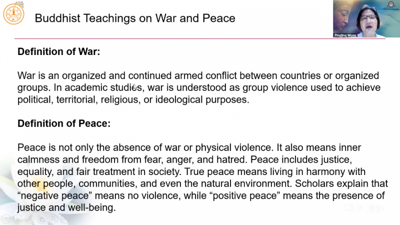 Teaching Assistant of International Buddhist College, Sis Wong Ping Ling shared on " Buddhist Teachings on War and Peace ".
