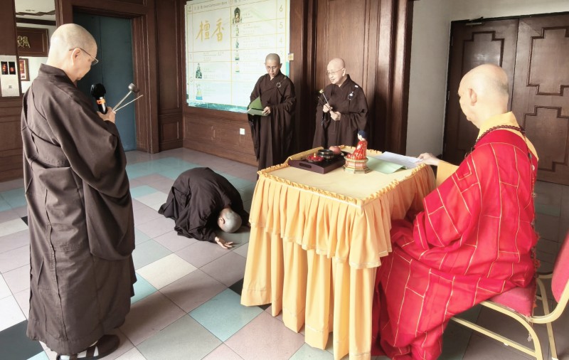 Following this, the repentance segment was conducted. Most Venerable Wei Wu led the novice nun in chanting the repentance verses three times, each line followed by a prostration, expressing sincere remorse for past misdeeds and vowing to cultivate diligently.