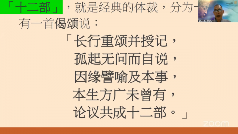有一首偈颂说:「长行重颂并授记,孤起无问而自说,因缘譬喻及本事,本生方广未曾有,论议共成十二部。」