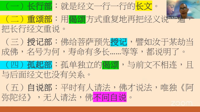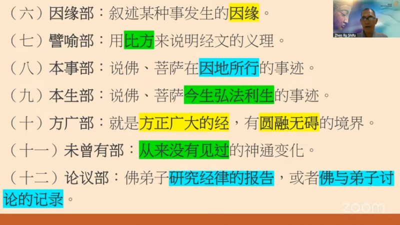 (五)自说部:平时有人请法,佛才说法,唯独《阿弥陀经》,无人请法,佛不问自说。(六)因缘部:叙述某种事发生的因缘。