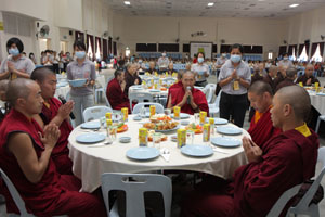 紧接下来是恭请各位斋僧的会首及副会首献灯,同时邀请槟州首席部长林冠英代表黄汉伟行政议员一起参与献灯仪式。接着,由南传法师诵经及由北传法师诵念《盂兰盆经》和「佛前大供」;供僧仪式正式开始。中午十二时三十分,大众供养果仪予诸位法师们;僧众用餐结束后,洪福寺住持文建长老以华语为信众们作简短的开示, 南传法师Ven. Boontam 则以英文作简短的开示。