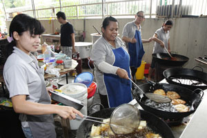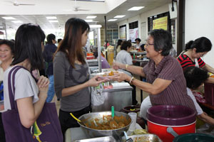 在这素食周里,许多人前来檀香寺享用早餐、午餐以及晚餐,斋堂里工作的职工及义工们都忙得不亦乐乎的。午餐时间,人潮更是把檀香寺挤得水泄不通,很多工厂的职员们都会前来享用午餐。檀香寺斋堂以及五楼礼堂的素食自由餐都看见人潮汹涌,各位职工及义工们都忙着把最好的食物以最佳服务态度献给前来檀香寺用餐的大众们。