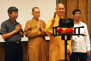 在工委会联合主席戴礼良居士与尤清吉居士、及檀香寺监院释真如法师的陪同下,唯悟法师鸣磬为2011年槟城国际卫塞电影节掀开序幕。