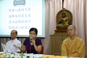 以上是约略的记述〈八万四千-佛典传译〉执行负责人黄净蕊居士对佛典翻译百年大计的缘起与近况所作的介绍。当晚黄居士以流畅规范的中、英双语讲述,加上幻灯片的辅助,让与会者对〈八万四千-佛典传译〉这项艰辛的百年大工程,有一个完整的认识。