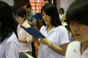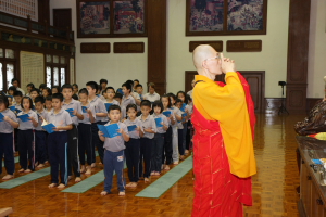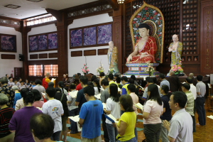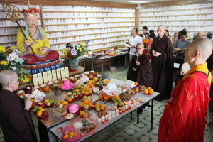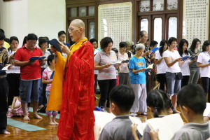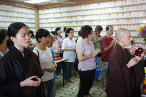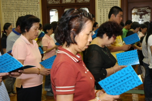 2011年8月14日(农历七月十五),檀香寺一如往年的举行《佛说盂兰盆经》共修法会。上午十点半,大众齐聚六楼大雄殿。监院真如法师担任中尊,首先向大众讲解‘盂兰盆’的意义,并依照本寺住持唯悟法师以前的开示,教导大众在诵经共修前,了解‘前行’、‘正行’与 ‘结行’的正思惟或观想。