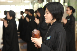 这次的一日修,除了中午一个半小时的过堂用斋加饭后经行、傍晚半个小时的休息及晚上一个小时的听闻佛法开示之外,其余的时间是各占四十五分钟之六支香的念佛、绕佛、止静;一支香的拜愿、忏摩(忏悔);一支香的念佛、止静;一个小时的晚课,和四十五分钟的大回向。每支香之间只有十五分钟的间歇,是属于精进密集的修行方式。