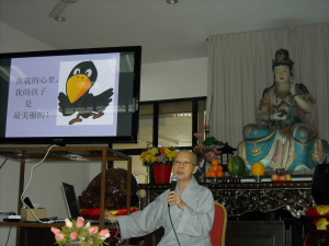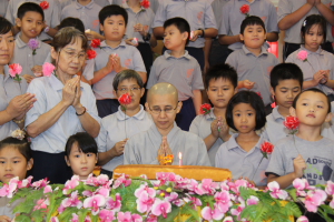 庆生会以“欢迎歌”掀开序幕,欢迎在百忙中抽空而来的爸爸妈妈。爸爸妈妈也很开心,并给予小朋友们热烈掌声。大会恭请慧修师父为小朋友及家长开示。师父以活泼生动的《乌鸦故事》把孝顺父母的含义带出来,更不时提醒小朋友母爱的伟大。师父要小朋友说出心里赞美妈妈的话,比如:我的妈妈最漂亮,我的妈妈最勤劳,我的妈妈煮的东西最好吃等。