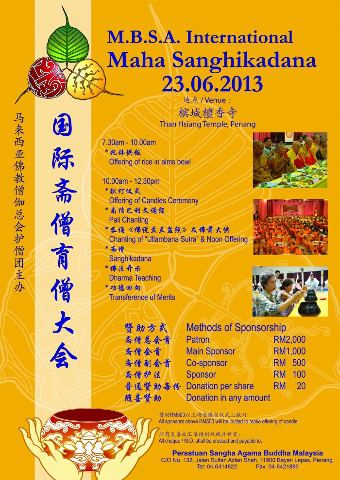 (槟城18日讯)马来西亚佛教僧伽总会护僧团订于2013年6月23日(星期日)假槟城峇央峇汝檀香寺盛大举办【国际斋僧育僧大会】。