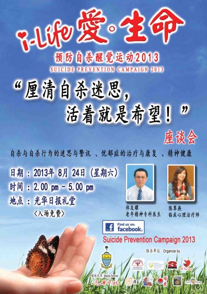 配合“世界预防自杀日”檀香爱心福利中心和槟州一些非营利单位将于8月至11月间,联合主办一系列预防自杀活动。今年的筹委会主席兼临床心理治疗师陈翠燕在8月5日记者招待会上指出,今年的活动将针对青少年的自杀行为,自杀行为中的高危险因素,自杀征兆,以及与预防策略等议题, 做深入的研究或探讨。