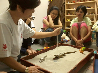 7月14日,何雪仙老师(Priscilla)心灵创意中心创办人到檀香爱心福利中心沙箱治疗室为一群资深面谈辅导义工们进行游戏治疗团体督导。老师通过游戏的方式引导义工们重新体会游戏治疗的主要精髓,老师说“玩游戏是个自然的过程,不是一项强制性的行为,就让儿童本身引导游戏的过程”。而且游戏治疗不只有通过沙箱进行,还有很多方式可以进行,游戏治疗的有效性,关键在于治疗师本身的创意及适当性引导儿童进行治疗。老师同时也强调发生在儿童的心理问题不是儿童本身问题,那是涉及整个家庭,每个家庭成员都扮演重要的角色影响孩子的心理。所以治疗师必须对小孩历史背景要有一定的敏感度。