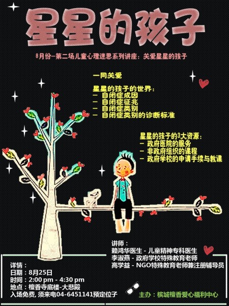 檀香爱心福利中心于六月份开始连同一群专业的临床心理治疗师及精神专科医生发动一系列的《儿童心理迷思系列讲座2013》。此系列活动缘起是檀香爱心福利中心的辅导协商员-苏丽婷在近十个月的非正统数据内发现大众对孩子的天性与儿童心理症状存有无法拿捏的模糊地带而发起的。我们存有的迷思例如,当孩子在表现常常处于动态时,怀疑孩子是否是过动儿。当孩子在学校表现格外安静时,被怀疑孩子是否是自闭儿。到底我们对孩子精神状况了解有多深?笔者-檀香爱心福利中心辅导协商员看见一些潜在的心理迷思危机,当这些迷思若没有拿捏好,却又把孩子给依样画葫芦的标签着,如“过动儿”、“自闭症”等等,那将极可会有带给孩子偏差的成长环境与对待。而日子久了,这些偏差的成长环境与对待可将间接变成孩子“病症”的环境因素。有迁于此,中心联系多名专业临床心理治疗师及精神专科医生在六月开始将给予大众一系列的专业解答。