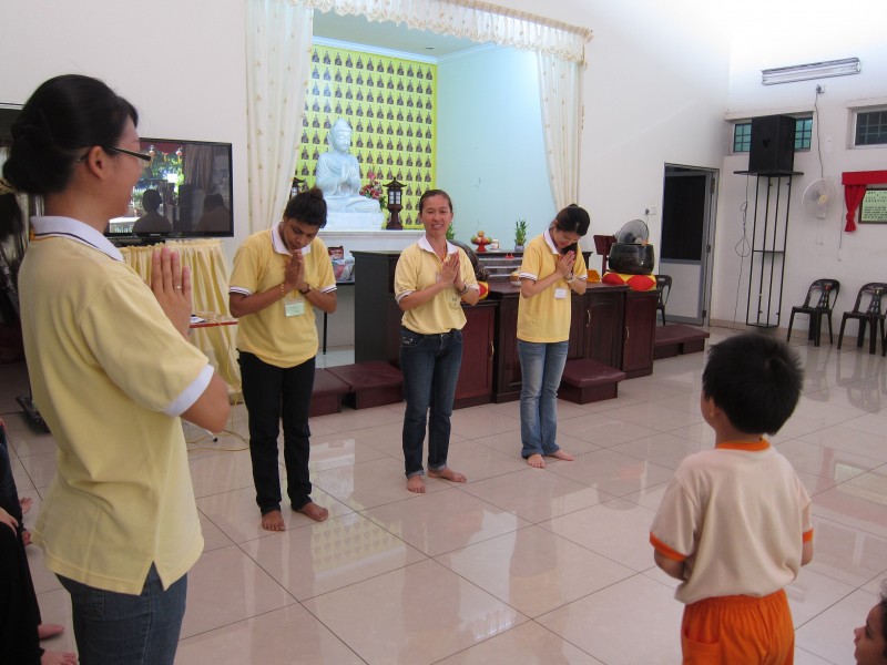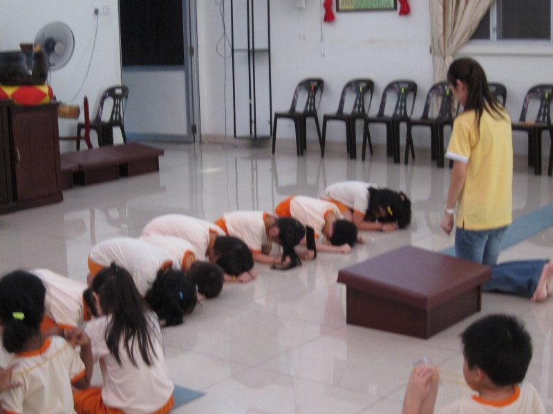 为了舒缓小菩萨们紧张的心情,团康负责老师 - 赖老师安排了15分钟轻松的早操,唱歌及手语,让小菩萨以愉快的心情继续参与接下来的学佛行仪-问讯与礼佛。吴老师先负责教导老师们,再由各组老师带领组员们认真及用心地学习。