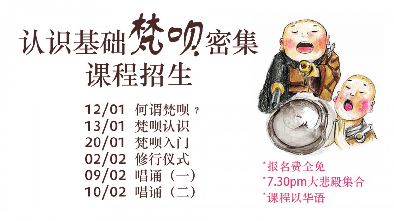 檀香寺梵呗组将於二零一五年一月开办『基础梵呗密集课程』。凡对梵呗唱诵有兴趣﹐想对梵呗唱诵更深入了解与探讨者﹐欢迎报名此密集课程。报名费全免请於以下日期晚上七时叁十分在大悲殿集合。课程以华语为主﹐每堂课程两小时。
