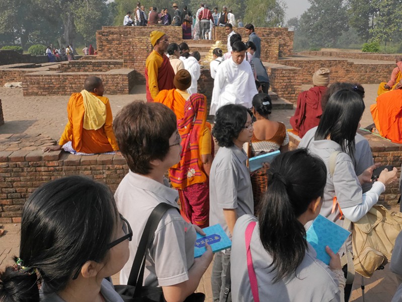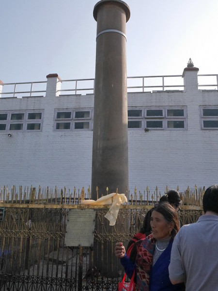 到达摩耶夫人寺。我们列队进入寺内,并在里面诵经念佛。师父请到一位当地导游负责解说,陈垣志居士帮忙翻译。我们在那里也看到了由佛教大护法,印度孔雀王朝的第三代君主阿育王所建的石柱。
