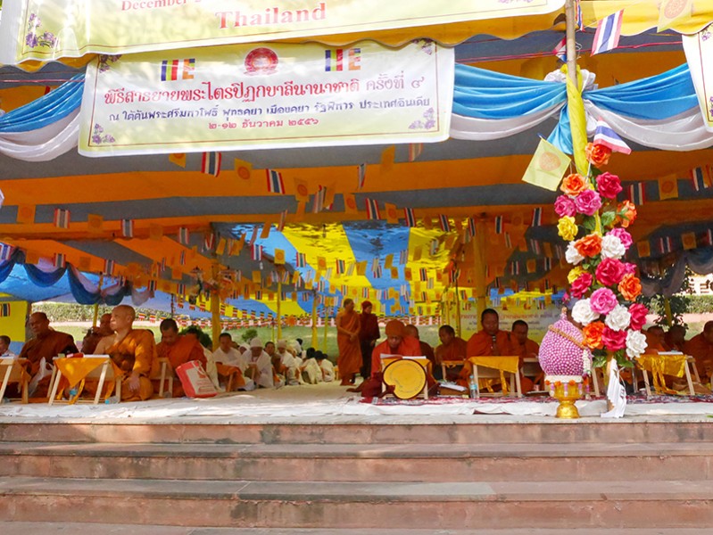 在寺内吃完早餐,又一次步行到金刚塔。师父带领我们四处巡礼,并讲述佛陀成道前后的修行历程,我们也看到了佛陀成道的金刚座。刚好遇到这里举办“第九届国际念诵巴利文佛经大会”(The 9th International Pali Tipitakal Chanting)(02 – 12/12/2013),四处人头攒动,特别的拥挤。各国的僧侣和信徒代表聚集在金刚塔四周诵经礼佛。很不可思议的是,大家专心诵念各自的经文却完全不受干扰。如果不是身历其境,真的很难想象,真的很神奇!