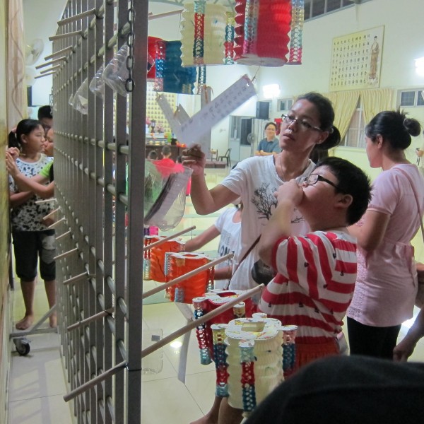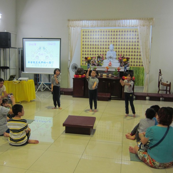 余兴节目时段由邓宪章老菩萨独唱《花好月圆》这首充满中秋节气氛的歌曲掀开序幕;接下来,檀香周五佛学班的学生以手语的形式呈献《三好》这首有意义且轻快的曲子,呼吁大家做好事、说好话、存好心;檀香幼儿园的可爱的小菩萨带来了两支舞蹈——《因为我因为你》和《不要认为自己没有用》,纯真逗趣的表演让许多家长情不自禁地拿起手机大拍特拍。表演时段完毕之后,何老师就公布射灯谜的成绩,首两位答对每个灯谜的出席者都获得一份小礼物以资奖励。接着,亲子互动游戏——乒乓竞走,让家长与子女的欢乐声传遍整个佛殿。