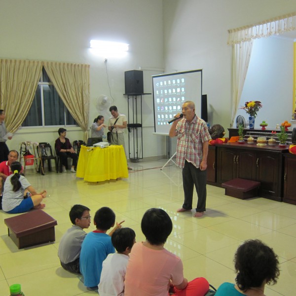 晚上七时半,维那在集鼓声后带领大众摄心念佛共修。大众坐下念诵阿弥陀佛圣号完毕之后,就观赏两个视频:第一个视频是德育卡通《快乐的中秋节》,希望大众从中领悟 “自私贪心使人厌,与人分享最开心”的道德价值观;第二个是大爱视频《中秋大团结》,带出大众通力合作以完成一件好事的快乐。
