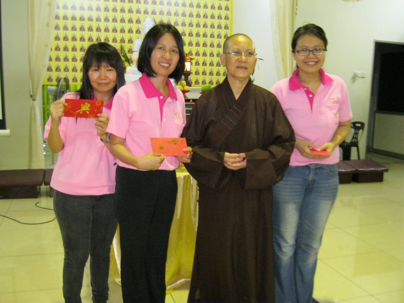 闻法欢喜后,真信法师颁发职员服务奖予在檀香幼儿园服务9年的吴宝琴老师、服务7年的邱巧叶老师和服务5年8个月的何泋锦老师。得奖者与师父合照后,余兴节目开始了。打头阵的是檀香幼儿园小朋友呈现的舞蹈《火鸡真美丽》和唐诗朗诵《春晓》,可爱的小朋友们活泼的表演赢得了大家的掌声;接下来,檀香晚晴苑的老菩萨们带来两首歌曲:《祝你新年快乐》和《春天里》,让大家可以提早感受到新年的快乐气氛;之后,陈侑德师兄独唱《真的想回家》,感人的歌词让部分佛友眼泛泪光;冯江子老菩萨独唱《马车夫之恋》和《你真美丽》后,就轮到苏丹阿都哈林师范学院学员的压轴表演《猴爷探檀香,佛来送囊香》,只见准教师们随着串烧新年歌曲表演一连串的手语,再由受小菩萨欢迎的“财神爷” 随着《财神到》的旋律派发红包给师父和老菩萨,让欢乐气氛洋溢整个佛殿。