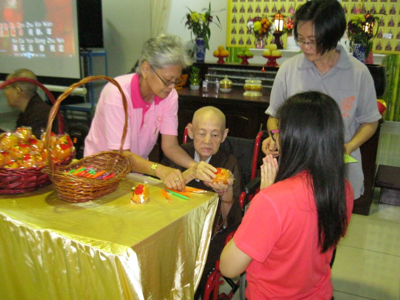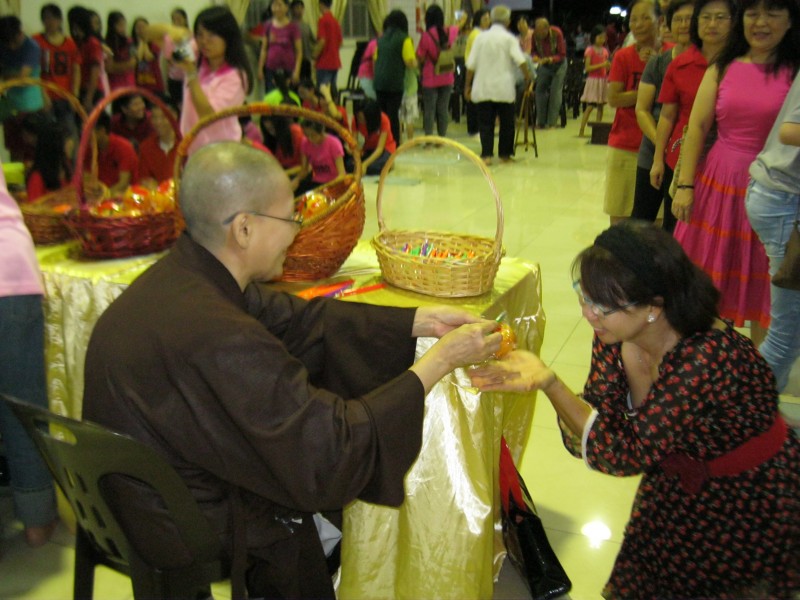 欣赏了精彩的歌舞表演后,真信法师分发结缘品——芦柑和“檀香”笔给大众。柑橘也叫大桔,它的谐音就是“大吉”,因而“得柑”意味得福报;送“檀香”笔则希望大众能笔底生花,写出智慧的话语,在学佛的道路上有所进步,有所成就!小小礼物大大祝福,希望大家增福增慧!大众享用一些糕点及甜品并与师父大合照后,乙未岁末团圆晚宴圆满结束。感谢筹委们及义工们的积极付出,信众们的踊跃参与。祝福大家新年进步,福慧增长,法喜充满!阿弥陀佛。