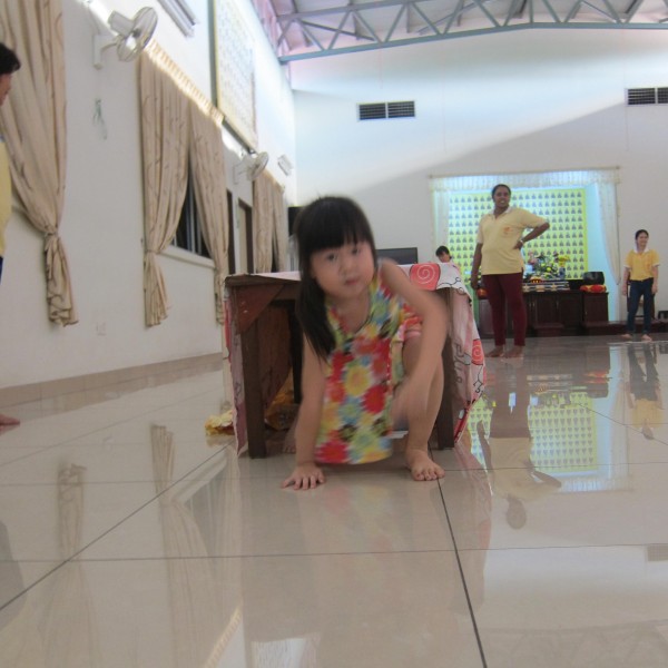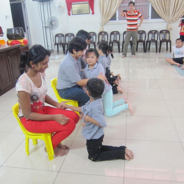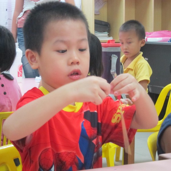 在分组后,孩子们各自设计组别图案及念口号,而后在何老师的带领下享用午餐,并学习念供养偈及结斋偈。午餐后,为了表达对父母的恩情,老师带领学生用纸条、木枝、彩色珠子串成一条爱心手链送给父母。