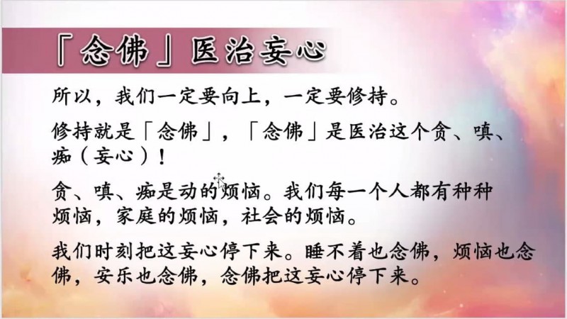 没有了动念,就是众生的真心佛性。 念佛可以对治贪瞋痴三毒,了解到“万般带不去,唯有业随身” 。