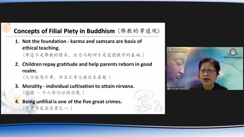 在佛教的孝道方面, 观业力与轮回是佛教的基础理论之一,而孝道不是佛教的根本。“善恶之报,如影随形”,业力通过一个人的行为在道德上所产生的结果会影响其未来命运的。在佛家看来,有一种方式增福消业最快。这种方式就是孝顺父母。孝顺父母乃世间最大的福田。周居士表示儿女作为最上的报答父母恩德之事是引导父母往生善趣。她举例《目犍连地狱救母》和《佛说善生经》讲解孝顺至道之法。父母为福田,所以说“善能事父母”,奉养父母这为福田从父母身上我们能获得吉祥。在《佛说善生经》中讲述佛陀教导善生以为人子,当以五事敬顺父母。此外,佛教是以个人修行证悟涅槃,每个众生都有个清净的本性,修行就是要证悟到回归本来清净。当修行人回归本来清净,就是涅槃。她也指出,五逆罪是佛教所有恶业中最重者, 所谓五逆罪,是指杀父、杀母、杀阿罗汉、破和合僧、出佛身血。若犯其中之一,即堕无间地狱。 不孝乃是五逆罪之一。父母恩德太大,我们的生命得自于父母。父母养育,恩同天地,身为儿女当竭力孝养父母,奉事师长,以报父母恩,杀父母亲是为逆罪,即堕无间地狱。