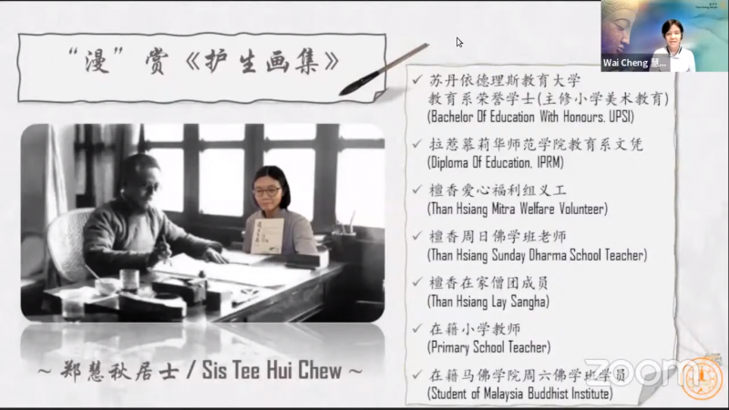 今晚的佛法分享中,大家以赏画来闻法。郑慧秋居士简介丰子恺先生的生平和画集的缘起后,便带领大家一起于荧幕中漫赏画册。《护生画集》 是弘一大师和丰子恺共同创作,由丰子恺作画,弘一大师题写诗文。本着以提倡仁爱,劝人戒杀从善,建立众生皆平等观念,促进人与自然的和谐共处。丰子恺先生的画作大都以现实生活周遭的人事物为主。除了彰显宣扬戒杀,也从童趣写实的画作中展现了丰子恺先生护幼护生的慈悲情怀。分享中,郑慧秋居士也提及檀香基金会曾重刊了中英文版的护生画集,里头摘录着唯悟法师的重刊序言。此外,她也以丰子恺先生和自己是素食者的经验来鼓励大家持素。勉励大家茹素也是在造福,只要持素一餐,就能间接减少一份杀业。若没因缘持长素,可以做到常素也很值得随喜和赞叹。