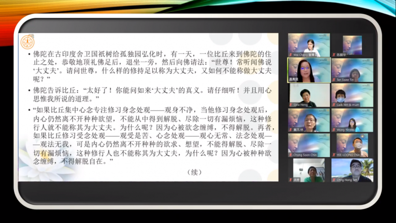 同时,高居士以深入浅出地阐述大丈夫与非大丈夫的区别。典故摘自《杂阿含经》卷第二十四(六一四)《离欲解脱大丈夫》,典故讲述我们的内心离不开种种的欲求、想望,不能得解脱、尽除一切有漏烦恼。由于心被种种欲念缠缚,不得解脱自在。这种修行人也不能称其为大丈夫。相同的道理,如果修行人修习受念处观——观受是苦、心念处观——观心无常、法念处观——观法无我,当他依身、受、心、法四念处专注修持、落实观行,使心远离贪爱、欲染,并从中得到解脱、尽除一切有漏烦恼,这种修行人足以称之为大丈夫。因为他的心已经解脱烦恼缠缚,得到自在。