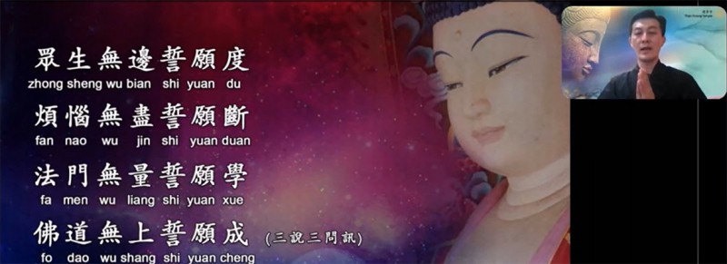 正式开始之前,主持人-慧秋为大家讲解流程以及仪规,宝华师兄为大家示范佛门礼仪-包括问讯以及合掌的方式。