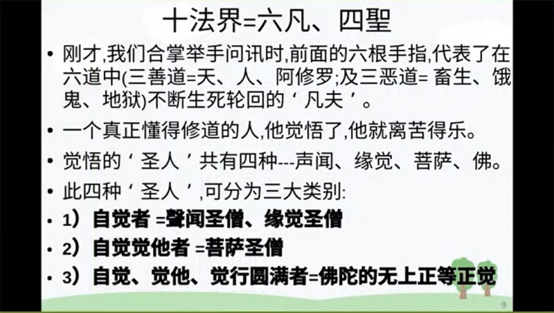 真如法师教导大家离苦得乐的方法,法师也开示皈依的意义。我们合掌举手问讯时,前面的六根手指,代表了在六道中(三善道=天、人、阿修罗;及三恶道=畜生、饿鬼、地狱)不断生死轮回的凡夫 。一个真正懂得修道的人,他觉悟了,他就离苦得乐。我们皈依三宝(佛、法、僧)」,严格上来说,是皈依 贤圣僧!除了佛陀是我们可以归投依靠的最高的圣人之外,还有‘贤圣僧’---阿罗汉、辟支佛、菩萨,也是我们可以归投依靠的圣人。