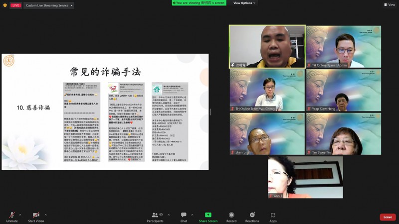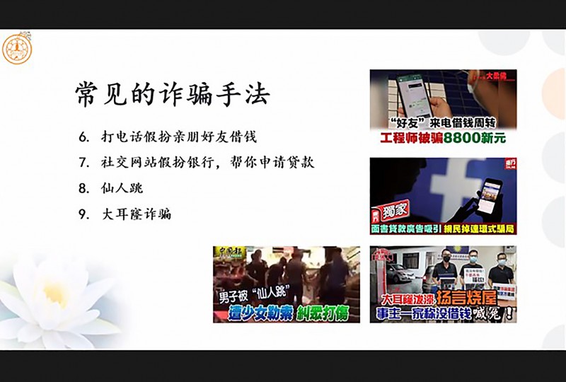 槟城檀香寺的经理及巴生檀香净苑负责人 - 谢明育居士分享他《预防诈骗》亲身经历的故事。他跟大家分享常见的十种诈骗手法如网络购物骗案、寻找工作骗案、电话诈骗(包裹、罚单、税务局欠款等)、 爱情包裹、投资骗案、打电话假扮亲朋好友借钱、社交网站假扮银行,帮你申请贷款、仙人跳和大耳窿诈骗。