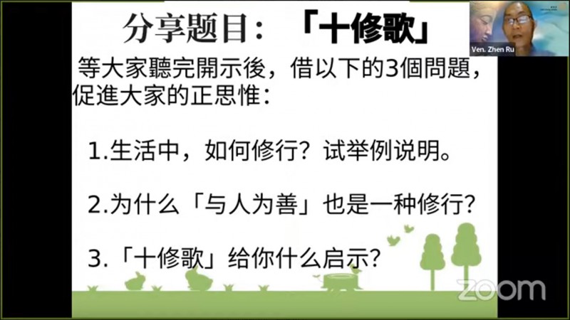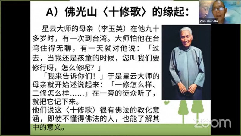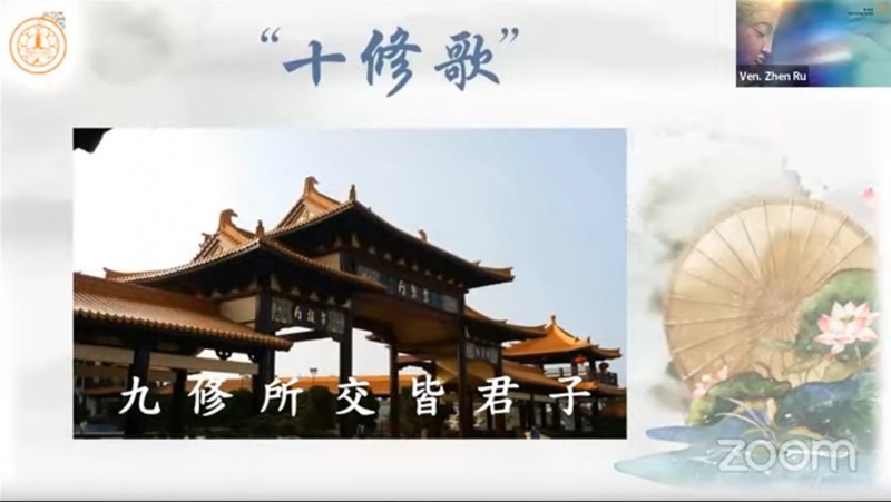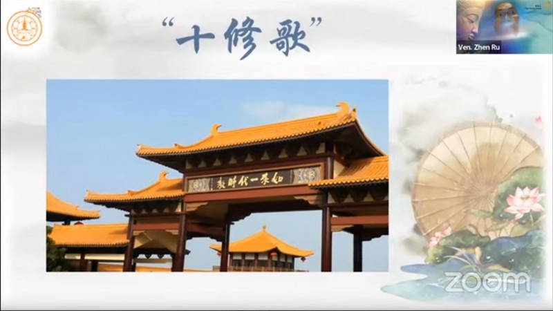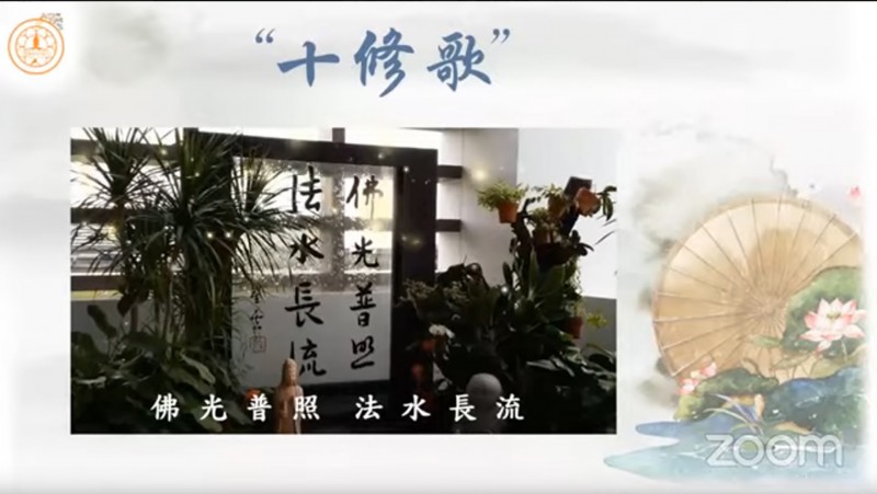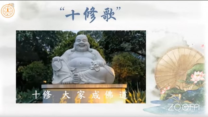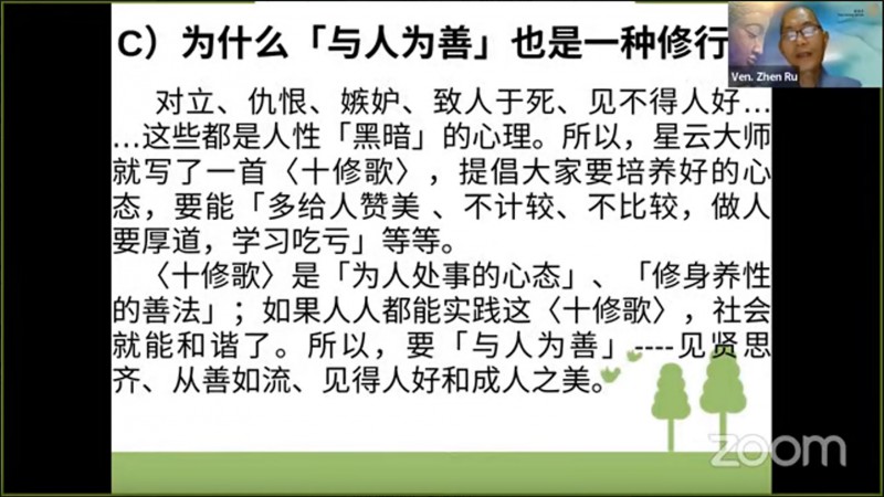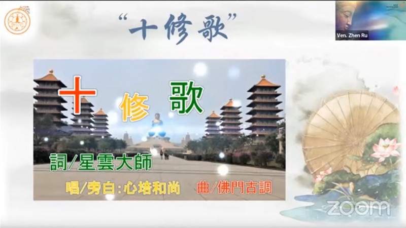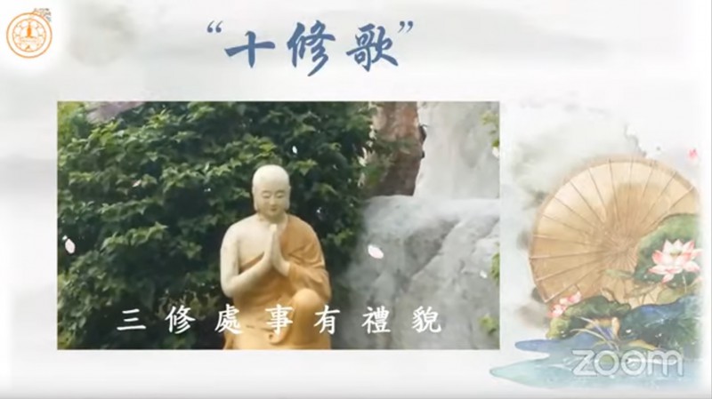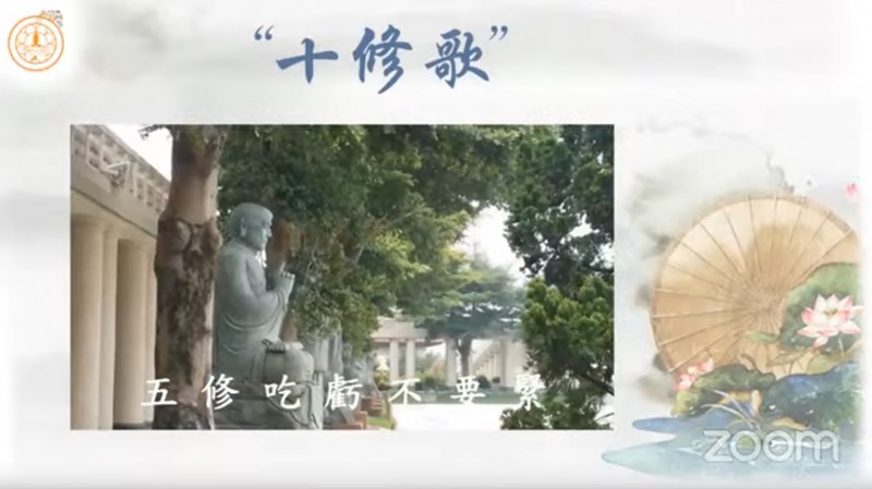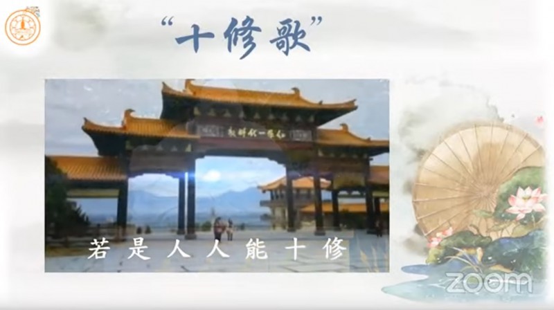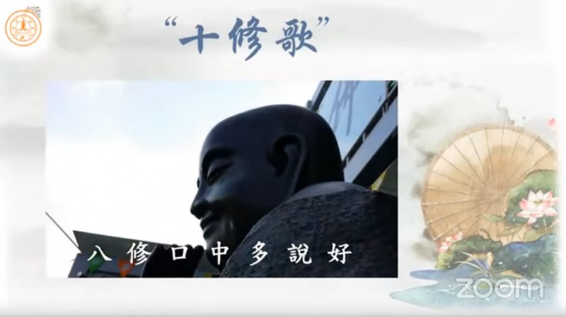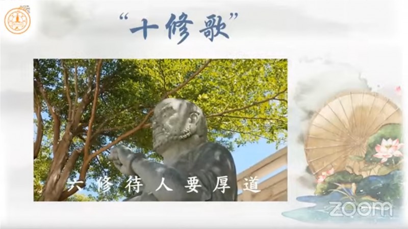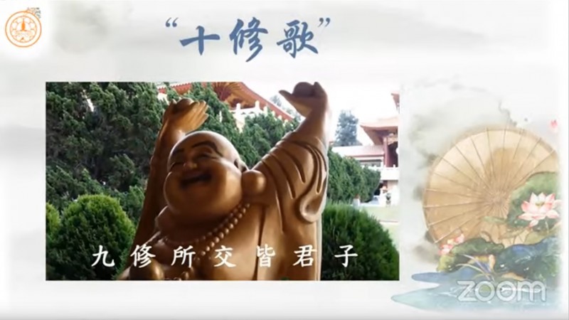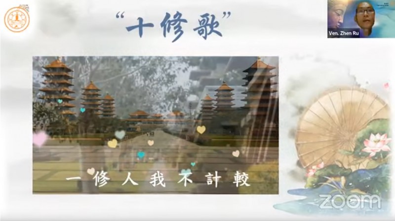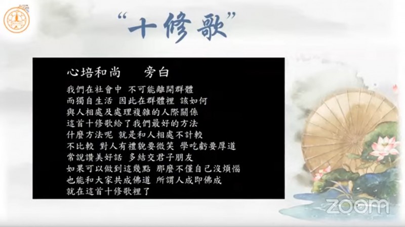 真如法师引用《十修歌》的内容,开示大众在人际关系上以及做人处事方面的准则,并且勉励大众把「十修歌」背起来: