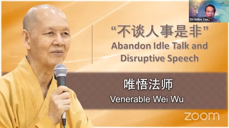 「静坐常思己过,闲谈莫论人非」,唯悟法师提到檀香寺不同地方的道场每天通过Zoom举行朝会,一起念发愿文提醒义工及职员「前来道场服务,不谈人事是非」,这也是处事待人的一种很好的方法,学习多看正面,学习「观功念恩」!
