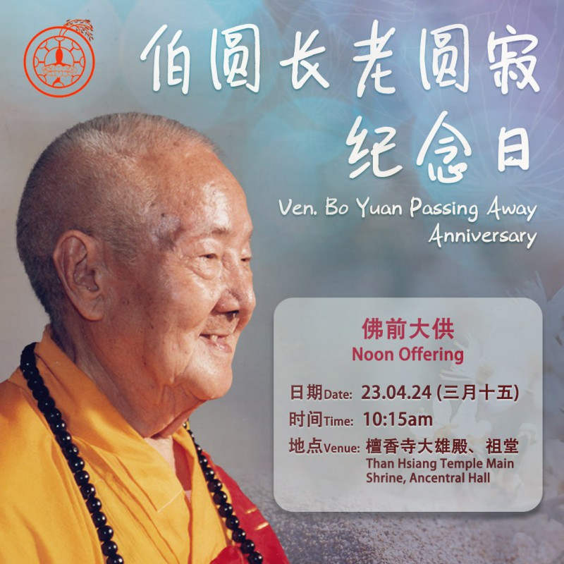 Submitted by aier on Tue, 16/04/2024 - 10:21 Body: 伯圆长老圆寂纪念日 佛前大供 日期 :23.04.24(三月十五) 时间 :上午10:15am 地点 :檀香寺大雄殿、祖堂 将佛学讯息传递出去,以接引更多人学佛,继续在学佛道路上精进,听经闻法。 欲知详情,请点击以下连接 Follow us on:https://linktr.ee/thanhsiang 宣传 Log in to post comments2324 reads