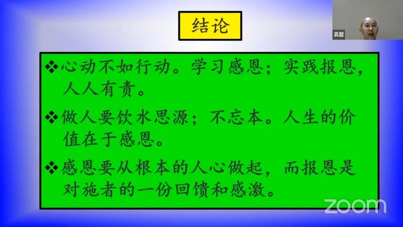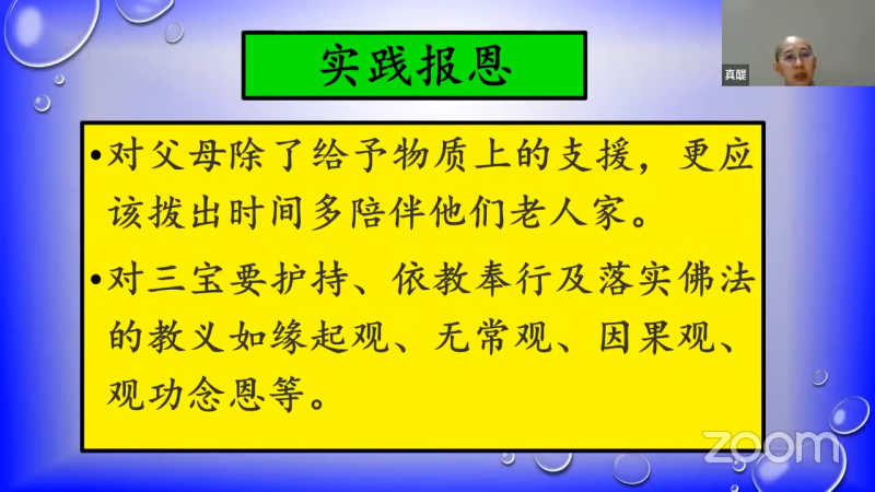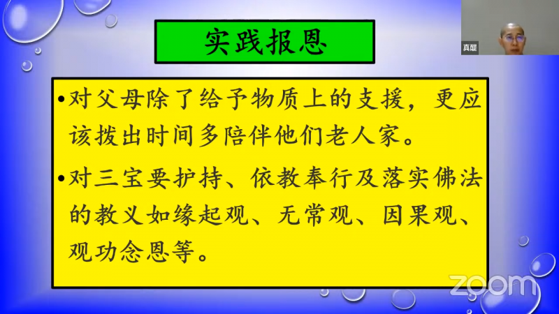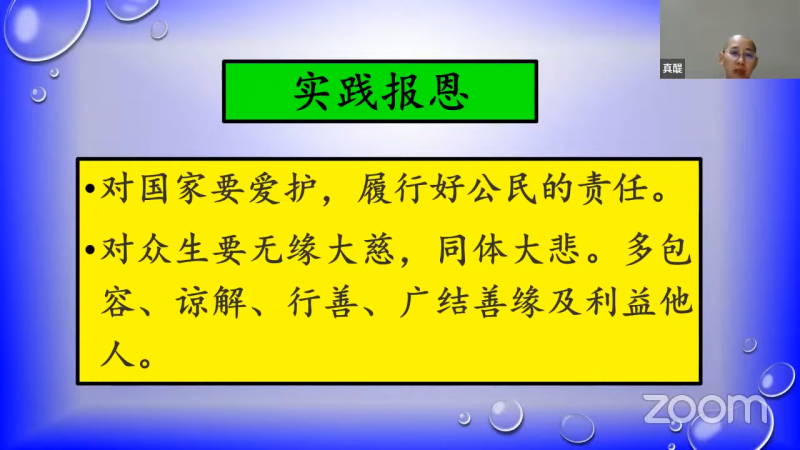 最后,真醍法师勉励大家,报恩是对施者的一份回馈和感激,也是人生的价值,因此我们要学习感恩、实践报恩!