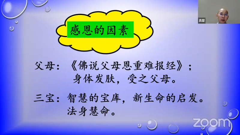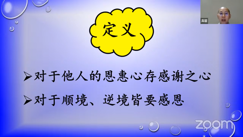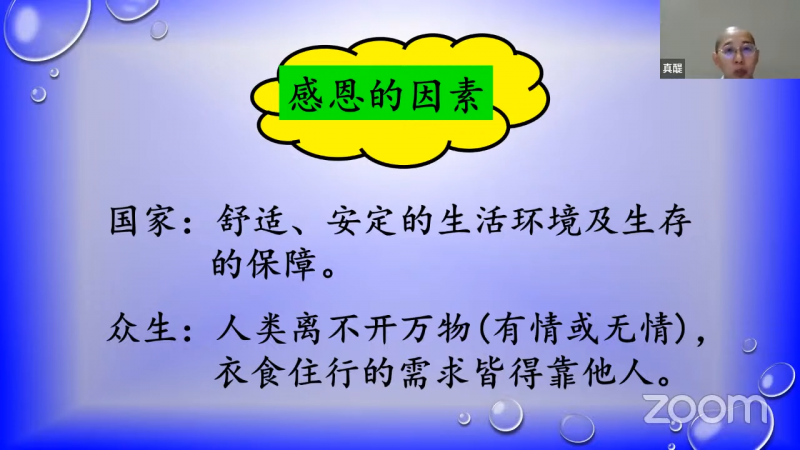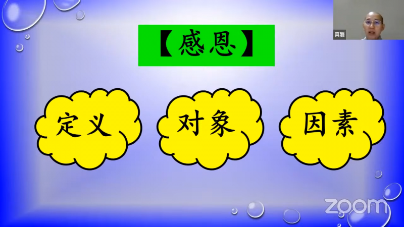真醍法师慈悲开示,感恩就是对于他人的恩惠心存感谢之心。人类离不开万物(有情或无情), 衣食住行的需求皆得靠他人,因此要观功念恩,多包容、谅解、行善、广结善缘以及利益他人,对于顺境、逆境都要心存感恩。