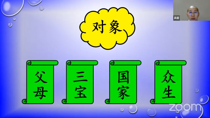 感恩的对象包括:众生﹑国家﹑三宝﹑父母。