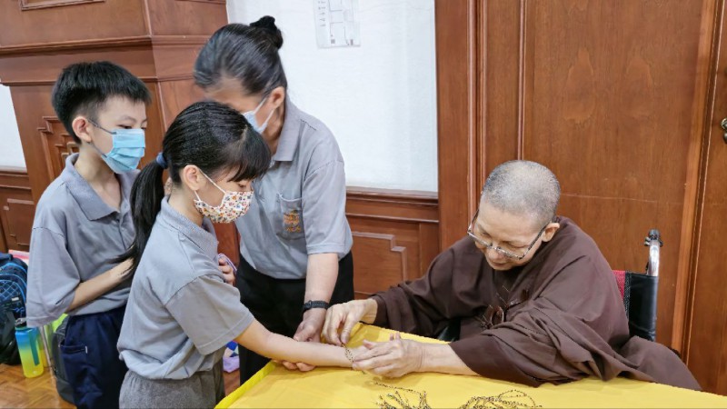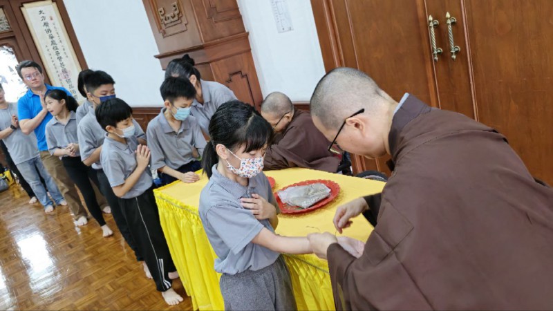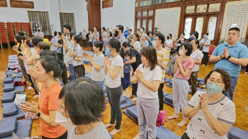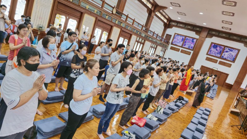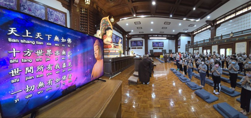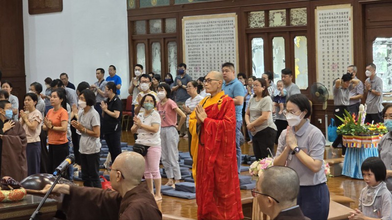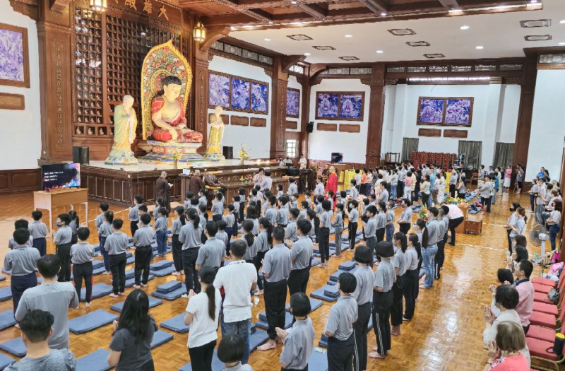 檀香周日佛学班的学员以及家人一早就来到檀香寺,在爱心妈妈的带领下到6楼大雄殿跟信众以及义工职员们一起参加法会。