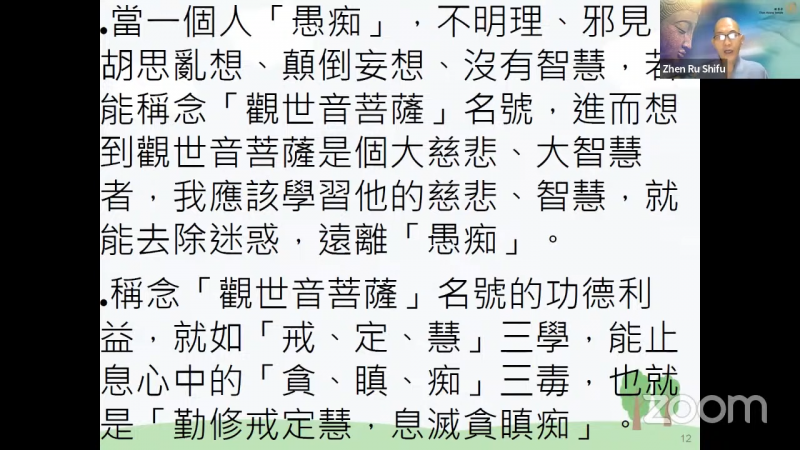 称念「观世音菩萨」名号的功德利益,就如「戒、定、慧」三学,能止息心中的「贪、瞋、痴」三毒,也就是「勤修戒定慧,息灭贪瞋痴」!